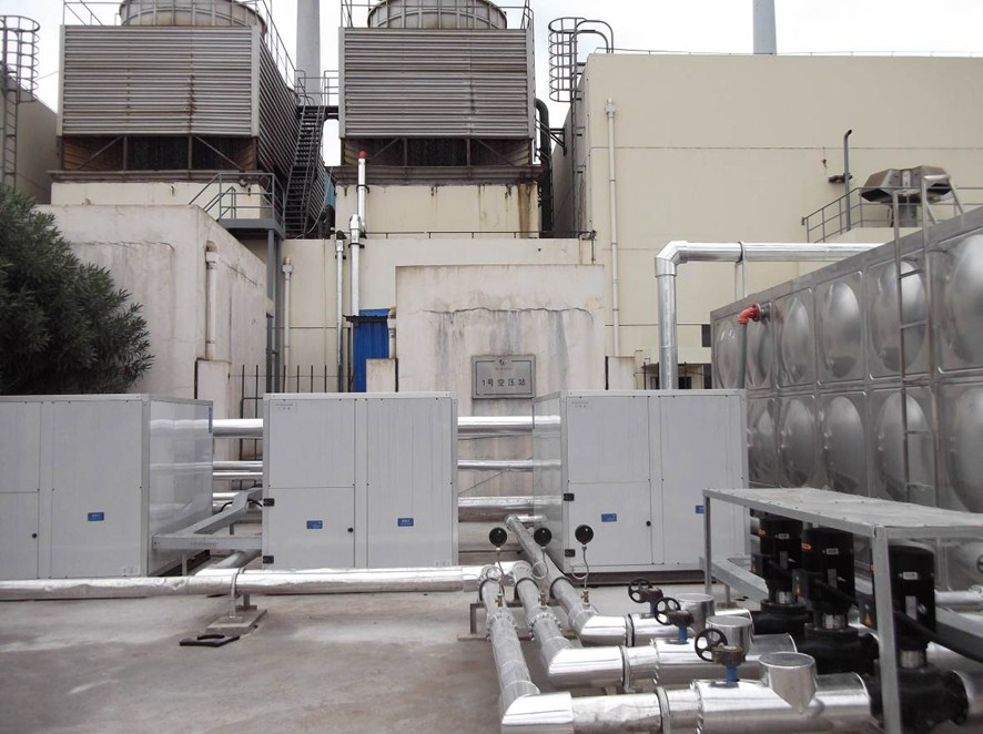 工程使用了3臺天舒熱能空氣源熱泵熱水機組作為主要加熱設備,每天供應100噸55℃的生活熱水,供1800名員工洗浴使用。